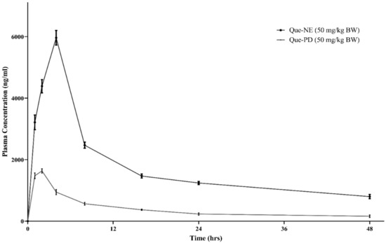 The HPLC technique was employed to study the pharmacokinetics of Que-PD and Que-NE in rat plasma after administration of a single oral dose. The mean plasma concentration–time profile is shown in Figure 6. The maximum plasma concentration (Cmax) and the time taken to reach Cmax (tmax) were obtained directly from this profile. The other critical pharmacokinetic parameters were calculated by the noncompartmental model, and are represented in Table 5. The Que-NE and Que-PD after a single oral administration reached the maximum drug concentration (Cmax) of 5962.74 ± 238.54 ng/mL and 1634.28 ± 70.18 ng/mL after 4 ± 0.0 and 2 ± 0.0, respectively. It was observed that in contrast to Que-PD, the Cmax of Que-NE was 3.64-fold greater, indicating that the NE system was effective in increasing the Que absorption. The Que-NE had a delayed tmax compared with that of Que-PD, indicating that the NE system could have resulted in the sustained release of Que from the system. Additionally, the mean resident times (MRTs) of Que-NE and Que-PD were 46.13 ± 9.91 h and 28.78 ± 8.44 h, respectively. This higher MRT could be attributed to the sustained release of Que into the systemic circulation. The NE system had decreased the distribution of Que by 3.04 times compared with that of Que-PD. In contrast to Que-PD, the AUC0-t and AUC0−∞ were 4.46 and 5.32 times higher, respectively. These indicated that Que-NE had enhanced oral bioavailability due to the drug’s absorption and residence time delivered from the NE system [43].