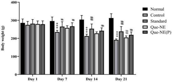 Effect of Que-NE and Que-NE (P) on body weight (BW) measured on days 1, 7, 14, and 21 of treatment. Data presented are the mean ± standard deviation. Significance was measured using one-way ANOVA. *** p < 0.001 vs. Normal group. # p < 0.05 and ## p < 0.01 vs. Control group (n = 6).