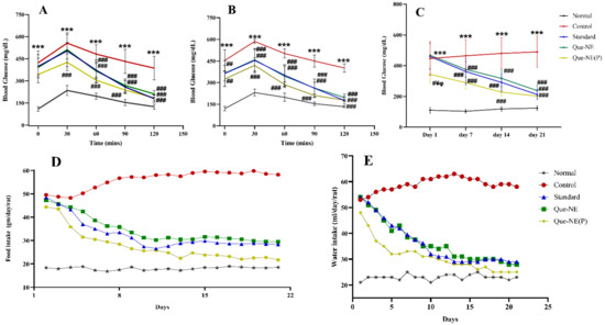 Effects of Que-NE and Que-NE (P) on: (A) oral glucose tolerance test on the 10th day; (B) oral glucose tolerance test on the 20th day; (C) blood glucose level (BGL); (D) food intake; (E) water intake. Data presented are the mean ± standard deviation. Significance was measured using one-way ANOVA: *** p < 0.001 vs. Normal group. # p < 0.05, ## p < 0.01, and ### p < 0.001 vs. Control group. ¥ p < 0.05 vs. Standard group, and φ p < 0.05 vs. Que-NE treatment (n = 6).
