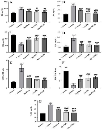 Effect of Que-NE and Que-NE (P) on various lipid profiles: (A) total cholesterol—TC; (B) total glycerides—TG; (C) high-density lipoproteins—HDL; (D) low-density lipoproteins—LDL; (E) cholesterol-to-HDL ratio—CHOL/HDL ratio; (F) HDL/LDL ratio; (G) very-low-density lipoproteins—VLDL. Data presented are the mean ± standard deviation (n = 6). Significance was measured using one-way ANOVA. *** p < 0.001 vs. Normal group. ### p < 0.001 vs. Control group. ¥ p < 0.05, ¥¥ p < 0.01, and ¥¥¥ p < 0.001 vs. Standard group (n = 6).