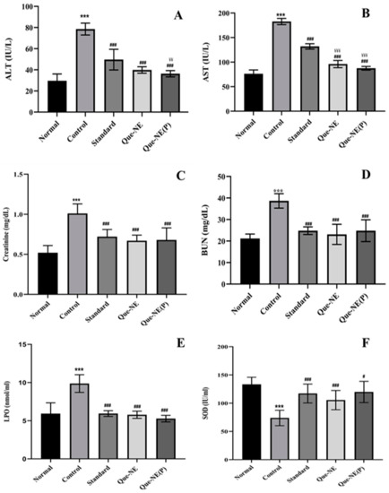 Effect of Que-NE and Que-NE (P) on: (A) alanine aminotransferase—ALT; (B) aspartate aminotransferase—AST; (C) creatinine; (D) blood–urea–nitrogen—BUN; (E) lipid peroxidation; (F) superoxide dismutase—SOD. Data presented are the mean ± standard deviation. Significance was measured using one-way ANOVA. *** p < 0.001 vs. Normal group. # p < 0.05, and ### p < 0.001 vs. Control group. ¥¥ p < 0.01, and ¥¥¥ p < 0.001 vs. Standard group (n = 6).