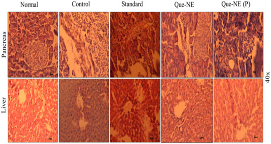 In the histopathological observations, the Control group exhibited disorganized islets of Langerhans and clusters of inflammatory cells. The β-cells showed dark-stained degenerated nuclei, and the liver portal vein was dilated with increased dark-stained hepatocytes due to apoptosis in the liver. A typical pancreatic structure with islets of Langerhans surrounded by exocrine acini and a natural population of β-cells was observed in the Normal group rats. The standard treated group exhibited an organized pancreas with decreased β-cells and darkly stained inflammatory cells. Sections of the liver cells showed a normalized liver with prominent hepatocytes. In the Que-NE treatment, the liver showed a typical structure, with well-organized portal veins with slight sinusoidal dilation, and the β-cells were observed to be elongated. However, the population of β-cells was normal with no degenerative changes. The Que-NE (P)-treated group showed reorganized pancreas cells with slight vacuolation in the Langerhans, and a normalized hepatic structure with radially arranged hepatocytes around the central vein was observed (Figure 11).