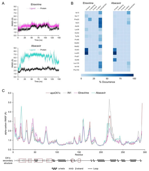 MD analyses for CK1ε-etravirine and CK1ε-abacavir complexes. (A) Protein backbone (black) and ligands (colored) RMSDs. (B) Heatmap of the non-covalent interactions occurrence for selected residues. (C) Protein backbone RMSF. The apo enzyme and the system CK1ε-IN1 are shown for comparison. Secondary structure of CK1ε is shown at the bottom with the catalytic domain in red squares.