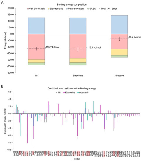 Binding energy-analysis. (A) Energy decomposition from systems with etravirine or abacavir were calculated from MD simulations. The system with IN1 is included for comparison. (B) Per-residue energy decomposition. Highlighted residues are part of the catalytic domain.