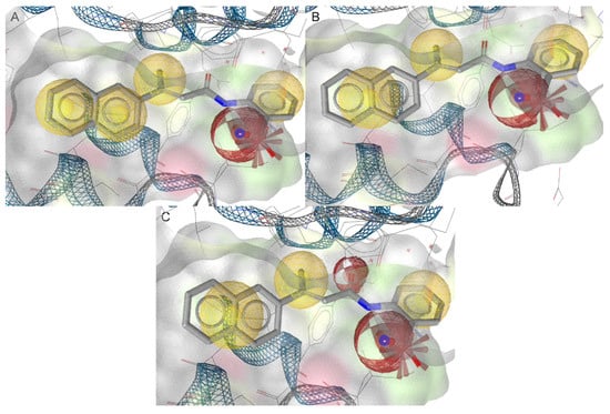 MYSHAPE [] is an approach in which the pharmacophore model is built using only the common pharmacophore feature patterns that the ligands exhibit during MD simulations. The evaluation of the ligand–protein interaction patterns during the MD simulation was investigated using the data recorded employing the MD simulation (exactly 1001 frames for each simulation). The MYSHAPE model was used to distinguish this type of model from the “default” pharmacophore models that were generated using the crystal structure of the ligand–protein complex. For the newly added pharmacophore features, the tolerance radius was increased by 0.15 Å to compensate for small deviations in the 3D coordinates. The computational details are reported in previously published papers [,]