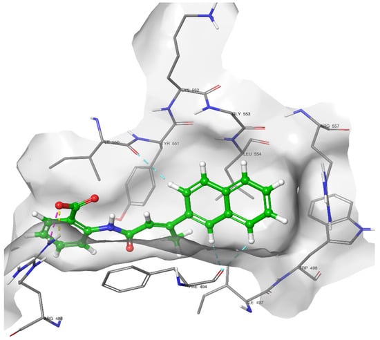 At the same time as the pharmacophore modeling, standard precision (SP) molecular docking studies were performed using Glide [], considering the conserved hydrophobic pocket (FVYL motif) where BIBR1532 binds. The docking studies were performed centering the docking boxes on the 3D coordinates of BIBR1532. The RMSD of BIBR1532 was calculated showing a value of 0.2 Å. The residues that characterized the binding site were Phe478, Met482, Met483, Arg486, Phe494, Gly495, Ile497, Trp498, Ile550, Tyr551, Gly553, Lys552, Leu554, and Arg557. BIBR1532 established an H-bond interaction and a salt bridge between the oxygen of the amide group and Arg486 and aromatic H-bond interactions between the naphthyl ring and Phe494 and Ile550 (Figure 2).