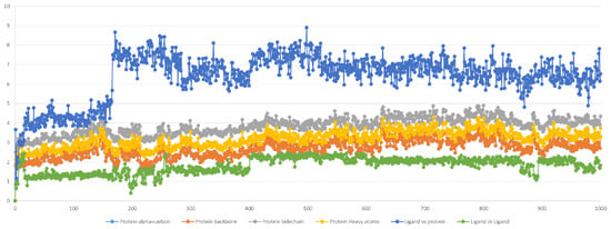 The RMSD was selected as a criterion to evaluate the dynamic stability of the ligand-bound system []. The RMSD values of the protein’s atoms and ligand are reported in Figure 5. The system reached equilibrium quickly and fluctuated around the average RMSD value of <3 Å. The average value of ligand vs. protein RMSD of ~6.4 Å indicated a strong stability of 2C in the binding pocket compared to the ligand vs. ligand RMSD of ~1.81 Å.