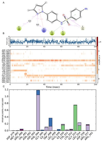 The analysis of the trajectory evidenced that the pi-stacking interaction between the aniline ring of 2C and Phe494 occurred at 57%. This output evidences a shifting in the pi-stacking interaction with respect to the docking where the central phenyl ring was involved, but it clearly defines Phe494 as a key residue in the inhibition pattern. As also reported in Figure 7B,C, Phe494 established at least one contact for the entire duration of the simulation and, for a major part of the time, 2–3 contacts with the phenyl ring of 2C. Gly553 showed for 57% and 17% of the time two H-bonds interactions with the oxygen of the sulfonamide group emerging after ~18 ns of simulation. Interestingly, after 22 ns of the simulation a new in pi–cation interaction appeared for 14% of the time between Arg557 and the pyrazole ring, even though it was in a spotted fashion. During the first 20 ns (16% of the total time), the protein–ligand interaction stabilized with an H-bond between Ile550 and the NH of the sulfonamide group. It is interesting evidence of the role of a water molecule as a water bridge between Trp498 and the pyrazole ring. Other residues involved in the protein–ligand interaction but with a minor role were Arg486, Ile497, Trp498, Tyr551, Lys552, and Leu554.