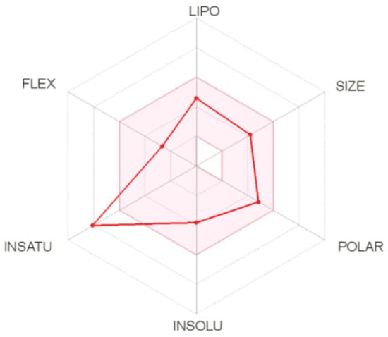 ADME calculation for compound 2C was performed using the SwissADME web tool []. In the hexagon drug-likeness graph (Figure 8), each vertex represents a parameter that defines a bioavailable drug. The pink regions represent the optimum range of the following six properties: lipophilicity = 2.53 (XLOGP3 between −0.7 and +5.0), size = 342.42 g/mol (MW between 150 and 500 g/mol), polarity = 98.39 Å2 (TPSA between 20 and 130 Å2), solubility (log S not higher than 6), saturation = 0.12 (fraction of carbons in the sp3 hybridization not less than 0.25), and flexibility (no more than nine rotatable bonds). It was found that compound 2C was slightly outside the pink area on one side due to the inconformity of its insaturation. The pharmacokinetics analysis showed that compound 2C is probably not a P-glycoprotein (P-gp) substrate and not BBB permeant. It has potentially good gastrointestinal (GI) absorption and ABS, up to nearly 70%. The %ABS, a very functional physiochemical variable, defines a drug’s transport properties. It was calculated according to the equation %ABS = 109 − (0.345 × TPSA) [,]. TPSA values below 98.39 Å2 characterize a significant permeability in the cellular plasma membrane. It has a bioavailability score of 0.55, which means good pharmacokinetic properties according to the Rule of 5 by Lipinski [].
