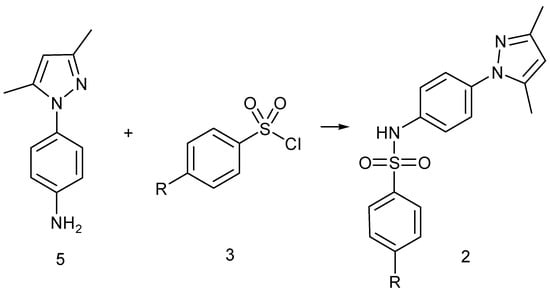 Our approach to targeting derivatives of type 1 and 2 involved reactions of the sulfonyl chloride 3 and suitable benzylamines 4 or amine 5, according to Scheme 1 and Scheme 2. The benzylamines were commercially available, whereas the 1-(4-aminophenyl)-3,5-dimethylpyrazole (5) was prepared in two steps from acetylacetone and 4-nitrophenylhydrazine and the subsequent reduction of the nitro group with H2 and Pd/C, using standard literature methodology (see Section 4).