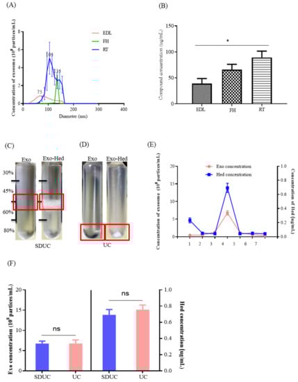 Optimization of the different extraction and compound loading methods for the exosomes. (A) The sizes (diameter, nm) of the exosomes obtained by the three different methods were measured and compared by NTA. (B) UHPLC-MS was adopted to detect the herbal Hed concentration of the exosomes loaded by the three selected compound cargo loading methods (EDL, FH and RT). (C) Pictures were captured to show the presence of the precipitated Exo and Exo-Hed vacuoles extracted by the SDUC method. (D) Pictures were captured to show the presence of the precipitated Exo and Exo-Hed vacuoles extracted by the UC method. (E) The Exo concentration and the Hed concentration of the seven fractions obtained by SDUC were examined by NTA and UHPLC-MS, respectively. (F) The Exo concentration and Hed concentration obtained by SDUC and UC were detected by NTA and UHPLC-MS, respectively. All of the experiments were performed as three independent experiments. One-way ANOVA was used to compare the data, * p < 0.05.