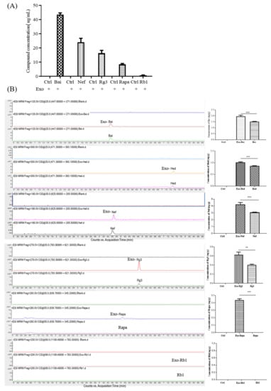 The exosome-encapsulated compounds (Exo-Bai, Exo-Hed, Exo-Nef, Exo-Rg3, Exo-Rapa and Exo-Rb1) were prepared by the RT method, as described []. In brief, 100 μg Bai, Hed, Nef, Rg3 and Rb1 (purchased from Sichuan Weikeqi Biological Technology Co., Ltd., Sichuan, China) or Rapa (purchased from Guangzhou Tomums Life Science Co., Ltd., Guangdong, China) were incubated with exosomes (25 μg) in a ratio of 4:1 in PBS at 22 °C for 18 h before being subjected to quantitation. For the FH method, the exosome-encapsulated compound (Exo-Hed) was prepared as described in the literature []. To begin with, the selected compound (Hed) and isolated exosome were mixed at a ratio of 4:1 and incubated at room temperature for 30 min before being rapidly frozen at −80 °C. The mixture was then thawed at RT. The freeze and thaw process was repeated 3 times. For the exosome-encapsulated compounds prepared by EDL, it was performed as described as in []. Firstly, the counted cells were seeded in a 75 cm2 culture flask until the cell density reached 60~70% confluence. Then, complete culture medium containing 10% FBS (without exosomes) and the selected compound (Hed) were added and incubated with the cells for 48 h. The cell culture supernatant was then collected and subjected to a sucrose gradient (with the gradually increased concentrations of 30%, 45%, 60% and 80% sucrose) centrifugation for 70 min at 100,000× g. The exosomal compounds were notable as a whitish band in the sucrose gradient located between 45% and 60%. The exosomal compounds were subsequently collected, washed and dissolved with PBS, and finally the concentration of the encapsulated compounds was quantitated by the UHPLC-MS system.