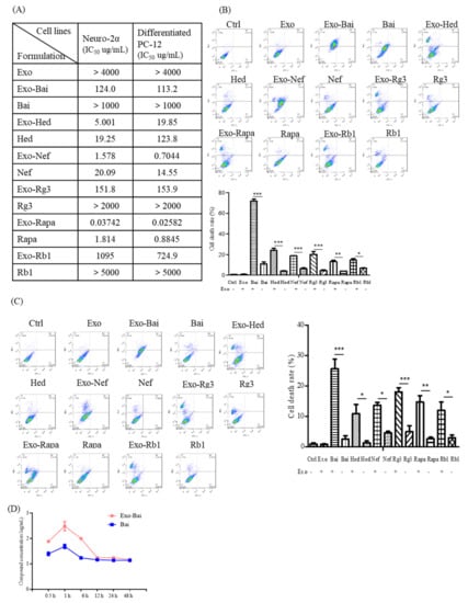 Exosome-encapsulated herbal compounds increase the cellular toxicity of different cell lines. (A) Cytotoxicity MTT assays of the Exo-compounds (the concentrations of Exo, Exo-Bai, Exo-Hed, Exo-Nef, Exo-Rg3, Exo-Rapa or Exo-Rb1 were 4000 μg/mL, 1000 μg/mL, 200 μg/mL, 5 μg/mL, 2000 μg/mL, 5 μg/mL and 5000 μg/mL, respectively) and herbal compounds alone (the concentrations of Bai, Hed, Nef, Rg3, Rapa and Rb1 were 1000 μg/mL, 200 μg/mL, 50 μg/mL, 2000 μg/mL, 5 μg/mL, 5000 μg/mL, respectively) were performed on both the differentiated PC-12 cells and neuron-2a cells by the MTT method after 48 h of the compound treatments. (B) Flow cytometric measurements of the cytotoxicity of Exo-compounds (the concentrations of Exo-Bai, Exo-Hed, Exo-Nef, Exo-Rg3, Exo-Rapa or Exo-Rb1 were 150 μg/mL, 3 μg/mL, 0.6 μg/mL, 100 μg/mL, 200 ng/mL, 600 μg/mL, respectively) and herbal compounds alone (the concentrations of Exo, Bai, Hed, Nef, Rg3, Rapa or Rb1 were 150 μg/mL, 3 μg/mL, 0.6 μg/mL,100 μg/mL, 200 ng/mL, 600 μg/mL, respectively) were validated on differentiated PC-12 cells and (C) Neuron-2a cells by flow cytometry after 24 h of the compound treatment. (D) The intracellular concentration of Bai on differentiated PC-12 was determined by UHPLC-MS at 0.5 h, 1 h, 6 h, 12 h, 24 h and 48 h after treatment with 10 μg/mL of Exo-Bai or Bai alone. All of the experiments were performed as three independent experiments. One-way ANOVA was used to compare the data: * p < 0.05, ** p < 0.01, *** p < 0.001.