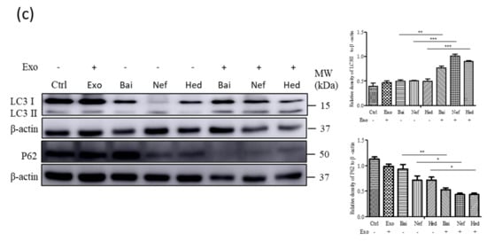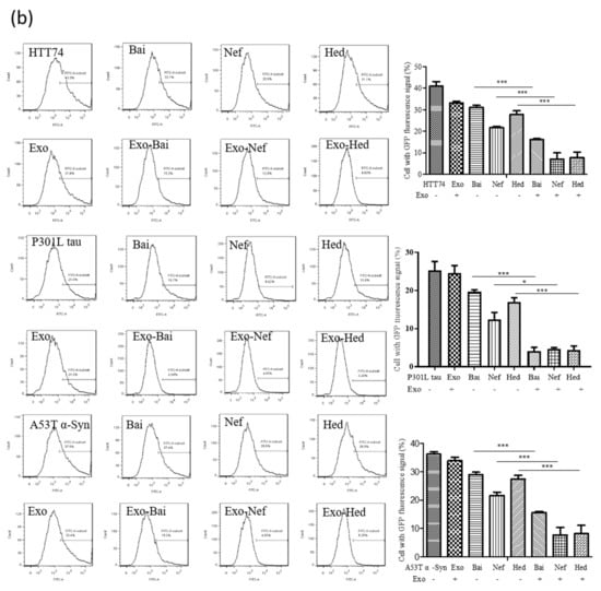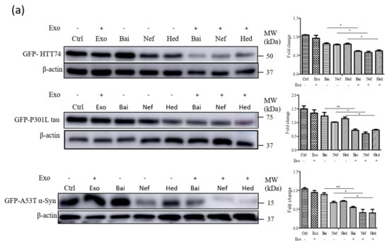 According to our previous studies and the reported literature, Bai, Hed, and Nef are able to reduce the level of mutant neurodegenerative disease proteins such as HTT74, tau P301L or A53T α-syn in vivo or in vitro [,,]; therefore, the in vitro protective effects of encapsulated Exo-compounds including Exo-Bai, Exo-Hed and Exo-Nef were compared with the compounds alone. To begin with, differentiated PC-12 cells were overexpressed with GFP-tagged mutant proteins including HTT 74, P301L tau or A53T α-syn, and were then treated with the Exo-compounds (Exo-Bai, Exo-Hed and Exo-Nef) or compounds alone (Bai, Hed and Nef), respectively. The Western blot results showed that the Exo-compounds (Exo-Bai, Exo-Hed or Exo-Nef) attenuated the protein level of the mutant proteins to a higher extent when compared to the same concentration of the compounds alone (Bai, Hed or Nef) (Figure 5A) (* p < 0.05, ** p < 0.01). Through flow cytometry analysis, the GFP-fluorescence signals of the mutant proteins were further quantitated and compared among the different treatment groups. As shown in Figure 5B, the GFP signals were significantly lower in differentiated PC-12 cells treated with Exo-compounds (Exo-Bai, Exo-Hed and Exo-Nef) (* p < 0.05, *** p < 0.001) when compared to the compounds alone. According to our previous study and the other reported literature [,], Bai [], Hed [] and Nef [] are able to enhance autophagy and facilitate the autophagic degradation of mutant proteins in cells. In order to confirm whether Exo-compounds can also increase the level of activation of autophagy, the autophagy-associated marker proteins LC3 [] and autophagic substrate p62 were evaluated. As shown in Figure 5C, Exo-compounds were able to reduce the cellular level of both LC3 and p62 proteins to a higher extent when compared to the compound-alone treatment groups (* p < 0.05, ** p < 0.01, *** p < 0.001), confirming the increased autophagy activity of the tested compounds after exosome encapsulation.