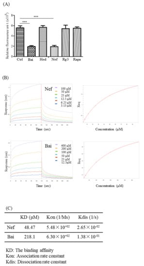 The validation of the Aβ-binding propensity of the compounds by ThT and BLI. (A) The inhibitory effect of the five selected natural compounds on fibrillation of Aβ (1–42) (the concentrations of Bai, Hed, Nef, Rg3 and Rapa were 50 μg/mL, 2 μg/mL, 0.5 μg/mL, 50 μg/mL and 150 ng/mL) were measured by ThT fluorescence intensity detection. All of the experiments were performed as three independent experiments. (B) Representative kinetic binding sensorgrams of increasing concentrations of Nef and Bai from 3.13 µM to 100 µM or 12.5 µM to 400 µM, respectively, were shown with real-time data acquisition for each step of the kinetic assay. (C) The optimal binding concentrations of the two herbal compounds (Bai and Nef) to Aβ (1–42) were 218.1 μM and 48.47 μM. One-way ANOVA was used to compare the data: *** p < 0.001.