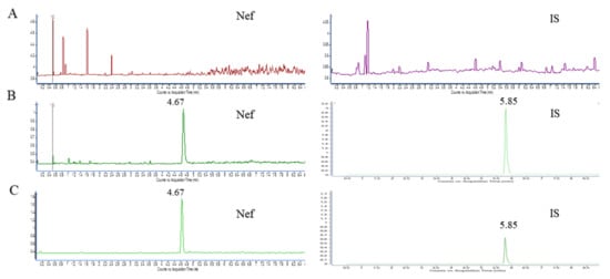 Representative chromatograms of Nef and IS in mouse brain homogenate. (A) blank mouse brain sample; (B) LLOQ brain sample; (C) mouse brain samples collected after the tail vein intravenous administration of Nef. IS: Resveratrol (Resv).