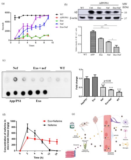 Exo-Nef effectively improved the motor behavioral deficiency of APP/PS1 mice and reduced the Aβ deposition in the mouse brain. (a) A rotarod test was used to observe the behavior of APP/PS1 double transgenic mice as described in the methodology section. (b) After the mice were sacrificed, the brain tissues were collected for further Western blot analysis on the level of the Aβ fibril normalized with β-actin. All of the experiments were performed as three independent experiments. (c) A dot blot analysis on the protein level of total Aβ in the mouse brain of different treatment groups was performed. (d) Pharmacokinetic study of neferine with or without the encapsulation by an exosome. (e) Schematic diagram showing the use of an exosome as a carrier for the selected neuroprotective herbal compound for crossing the blood–brain barrier in an AD mouse model. One-way ANOVA was used to compare the data: * p < 0.05, *** p < 0.001.
