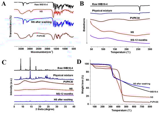 Characterization of pure IMB16-4 and NS: (A) FTIR spectra of NS, PVPK30, and pure IMB16-4. (B) DSC thermogram of PVPK30, pure IMB16-4, physical mixture, and NS. (C) XRD patterns of PVPK30, pure IMB16-4, physical mixture, and NS. (D) TGA spectra of NS, PVPK30, and pure IMB16-4.