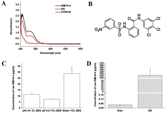 Characterization of pure IMB16-4 and NS: (A) UV–Vis absorption spectra of NS, PVPK30, and pure IMB16-4. (B) The chemical structural formula of IMB16-4. (C) Equilibrium concentrations of pure IMB16-4 and NS in different media containing 3% SDS. (D) The equilibrium concentrations of NS and pure IMB16-4 in water at 25 °C.