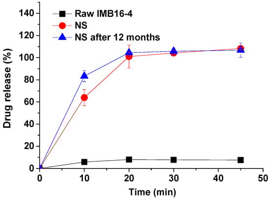 Release profiles of pure IMB16-4 and NS in pH 1.0 containing 3% SDS dissolution medium. Each data point represents the mean ± SD of three determinations.
