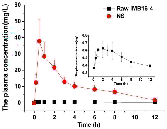 Plasma concentration–time profiles of pure IMB16-4 and NS. Results are expressed as the mean with the bar showing SD values of six rats.