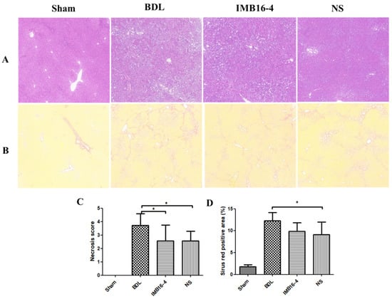 The BDL model is widely used to mimic human hepatic fibrosis, which is featured by collagen and extracellular matrix proteins deposition in the liver tissues [33,34]. Liver samples were stained with Sirius red and hematoxylin to evaluate hepatocellular damage and tissue fibrosis. As shown in Figure 6A, rats in the sham group had normal cellular architecture (Ishak score 0). Liver tissue in the BDL group demonstrated cellular damage and centrilobular necrosis. In BDL rats, liver tissue formed occasional bridges in the interstitial spaces, which was marked as Ishak score 3. In some BDL rats, these septa spread to form numerous bridges (Ishak score 4). After being treated with IMB16-4 and NS, liver tissue showed absence of bridging fibrosis; however, interstitial fibrous deposition was slightly observed (Ishak score 2). In a blinded assessment, the BDL-NS group had significantly lower scores for parenchymal necrosis than the BDL group (Figure 6C). In addition, NS attenuated the accumulation of collagen in the liver, which was shown by the substantial decrease in Sirius red positive areas (Figure 6B,D). The results indicate that NS play a therapeutic role in resisting hepatic fibrosis.