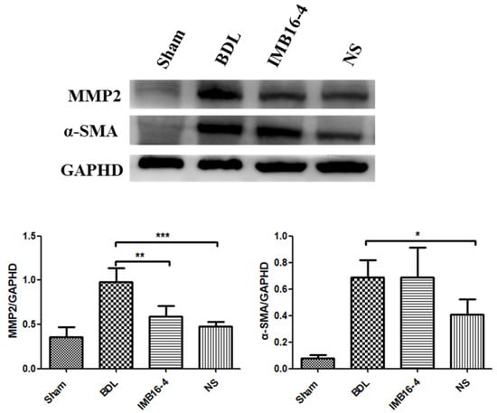 Western blot analysis and semi-quantitation of α-SMA and MMP2 protein levels in liver tissue. The values are expressed as the mean ± SD of four times independent experiments. * p < 0.05, ** p < 0.01 and *** p < 0.001 significantly different from the BDL group.