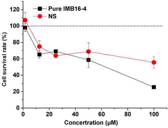 The cell survival rate of LX-2 cells at varying concentrations of pure IMB16-4 and NS. Each data point represents the mean ± SD of three determinations.