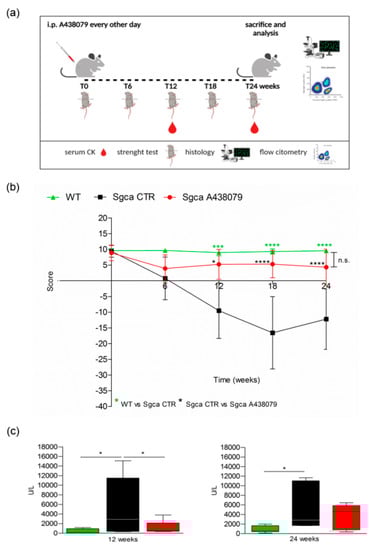 In order to evaluate the therapeutic efficacy of a selective P2X7-targeting compound in an experimental model of α-sarcoglycanopathy, we treated four-week-old male Sgca knockout mice (also termed Sgca-null) mice with A438079, a specific antagonist of P2X7 [26]. The drug was administered to Sgca-null (here from referred as Sgca) mice by i.p. injections at the dose of 3 mg/kg every other day for 24 weeks (Figure 1a). Sgca mice injected with PBS (Sgca CTR) and Wild-Type (WT) mice served as controls.