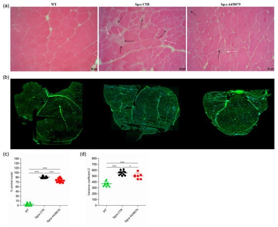 A438079 ameliorates the muscle morphology of Sgca mice. (a): frozen quadriceps tissue sections from WT, Sgca CTR and Sgca A438079 mice were collected at the end of the twenty-fourth week of treatment and stained with standard H&E technique. A representative image is shown. Black arrows indicate inflammatory infiltrates, white arrows indicate degenerating muscle fibers. Final magnification, 20×; (b): frozen quadriceps tissue sections from WT, Sgca CTR and Sgca A438079 mice were collected at the end of the twenty-fourth week of treatment and stained with wheat germ agglutinin (WGA) and DAPI. The whole quadricep section has been re-constructed; (c): percentage of central nuclei was quantified in four consecutive fields for each muscle section stained with wheat germ agglutinin (WGA) and DAPI and normalized for the fiber number of each field (WT n= 4; Sgca CTR n = 4; Sgca A438079 n = 4); (d): muscle fiber diameter variability from WT, Sgca CTR and Sgca A438079 mice was calculated in the whole area as variance coefficient Z of minimal Feret’s diameter (WT n= 12; Sgca CTR n = 12; Sgca A438079 n = 7). In panels (c,d), data are expressed as mean ± SD. Statistical analysis was performed by one-way ANOVA followed by Tukey’s multiple comparison test. Asterisks indicate statistical significance (*, p < 0.05; ***, p < 0.001).