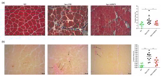 Fibrosis as characterized by replacement of muscle tissue with collagen deposits is the histopathological hallmark of end-stage muscular dystrophies, including alfa-sarcoglycanopathy [27]. In order to establish whether A438079 might impact collagen deposits, we performed a Masson trichrome staining on quadriceps of WT, Sgca CTR and Sgca A438079 mice and evaluated the fraction area of fibrotic reactions. As shown in Figure 3a, Sgca CTR quadriceps accumulated abundant extracellular matrix deposits which were increased in comparison to WT mice (mean value of WT mice: 1.47, n = 7; mean value of Sgca CTR mice: 2.92, n = 11, p < 0.05). A438079 treatment led to a 37% reduction of extracellular matrix deposition fraction area as compared to Sgca CTR mice (mean of Sgca A438079 mice: 1.85, n = 7, p < 0.05). No significant difference was observed between WT and Sgca A438079 animals.