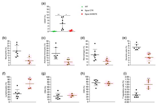 In order to better characterize the phenotype of inflammatory muscle infiltrates, we performed a cytometric analysis of a pool of limb muscles, including gastrocnemius, quadriceps and anterior tibialis, isolated from WT, Sgca CTR and Sgca A438079 mice. As shown in Figure 4a, limb muscles of Sgca CTR mice were characterized by the presence of CD45+ hematopoietic immune cells which, in contrast, were not detected in WT mice (WT vs. Sgca CTR, p < 0.01).