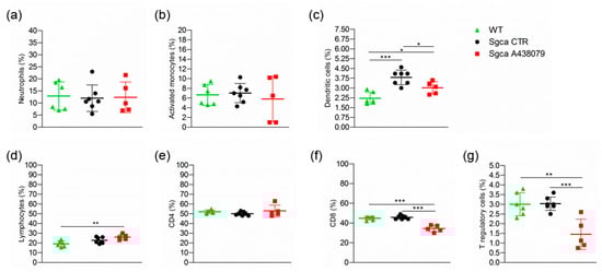 Furthermore, the analysis of the peripheral blood (PB) immune cell populations of WT, Sgca CTR and Sgca A438079 mice showed that the dystrophic animals presented significantly higher percentages of DC compared to WT animals (Figure 5c, WT vs. Sgca CTR, p < 0.001 for DC). Treatment with A438079 significantly reduced the percentage of DC, CD8+ lymphocytes and T reg cells (Figure 5c,f,g, Sgca CTR vs. Sgca A438079, p < 0.05 for DC; p < 0.001 for CD8+ lymphocytes and p < 0.001 for Treg).