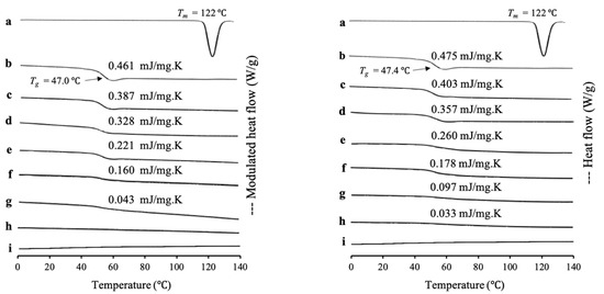 RTV/MPS1 prepared by the solvent evaporation method and melt method with weight ratios was evaluated by MDSC measurement, as shown in Figure 1. The RTV crystal showed a melting peak at 122 °C, while the amorphous RTV prepared by solvent evaporation (RTV EVPs) and melt method (RTV Ms) showed a glass transition event at 47.0 °C and 47.4 °C, respectively, and did not show a melting peak. This indicated an amorphous drug, which has good glass formers that does not crystallize even upon reheating. The heat capacity changes (ΔCp) of Tg of both RTV EVPs and RTV Ms decreased with a decrease in RTV concentration in MPS1, while the Tg remained constant. In RTV/MPS1 prepared by a solvent evaporation method, the glass transition event for RTV EVPs was observed in the weight ratio above 4:6. However, in the weight ratio of 3:7, the glass transition of RTV EVPs was not detected in the MDSC curve. The absence of a glass transition event of RTV EVPs was attributed to the monomolecular adsorption of RTV on the silica surface of MPS1 [29,30]. The remained glass transition event for RTV EVPs at the weight ratio above 4:6 showed that some RTV existed as amorphous RTV outside the pores of MPS1 [21,33].