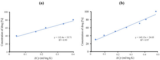 Plots of the concentration of RTV against ΔCp of amorphous RTV calculated from the DSC curves. (a) RTV/ MPS1 prepared by solvent evaporation and (b) melt method.