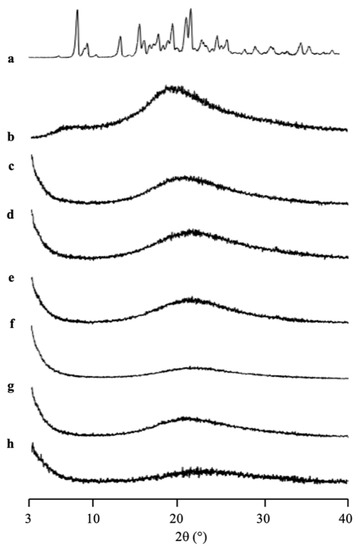 The PXRD patterns of CYP/MPS1 with various weight ratios prepared by solvent evaporation method are shown in Figure 5. The CYP amorphous state and all ratios of CYP/MPS1 showed a halo pattern without any diffraction peaks, indicating the amorphization of RTV/MPS1. Similar to RTV, this result was representative of the CYP amorphous state being stable. However, some CYP was outside of MPS1, specifically for the higher weight ratios of CYP/MPS1, due to the good glass formers that neither crystallize upon cooling nor upon reheating.