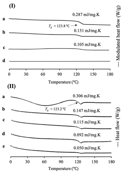 (I) MDSC curve and (II) DSC curve of (a) CYP amorphous state, CYP/MPS1 = (b) 7:3, (c) 5:5, (d) 3:7 and (e) 2:8. (I) CYP/MPS1 prepared by solvent evaporation and (II) melt method. Nonreversible signal is shown in Figure S4.