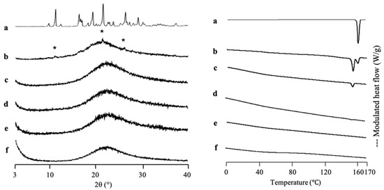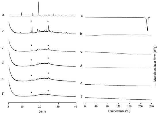 (Left) The PXRD patterns and (right) MDSC curve of (a) γ-IDM crystal, IDM/MPS2 = (b) 4:6, (c) 3:7, (d) 2:8, (e) 1.5:8.5 and (f) MPS2. Nonreversible signal is shown in Figure S5. * Characteristic peaks of IDM crystal.