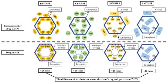 A speculated mechanism of each drug within MPS is discussed in this study (Figure 9). In the RTV/MPS1 system, RTV was amorphized by the solvent evaporation method. In MDSC measurement, the RTV was stable in an amorphous state even after heating, either in RTV alone or in the RTV/MPS1 system. This could be due to RTV being a drug with a low recrystallization tendency (class III) and a good glass former that neither crystallizes upon cooling nor upon reheating. Moreover, for RTV/MPS1, the nanoconfinement effect from MPS could further stabilize the amorphous state of RTV, due to the different sizes between the molecule size of RTV and the pore size of MPS1, which was not more than 20 times. The size of RTV was 18.2 Å × 15.2 Å, while the pore size of MPS1 was 80 Å. Previous studies have reported that drug recrystallization occurred within the MPS if the pore size was 20 times larger than the size molecules of the drug [31,46,47]. Therefore, MPS could suppress the critical nucleus size of RTV. The maximum loading amount of RTV/ MPS1 prepared by the solvent evaporation method was very close to the theoretical calculation of MCM, indicating that RTV was monomolecularly adsorbed on the surface of MPS1. A previous study reported that the hydrogen bonding between the C=O of RTV and the Si-OH of MPS was observed [48]. This strong interaction contributed to the monomolecular adsorption of RTV on the silica surface of MPS1. In contrast, the theoretical value of PFC was significantly higher than the experimental maximum drug loading; this could be due to the relatively small average pore size of MPS1 for RTV, resulting in a spatial limitation. Moreover, some pores may be too narrow to accommodate the molecules to be multilayers in the entire MPS1. Therefore, RTV was only able to cover the silica surface of MPS1.