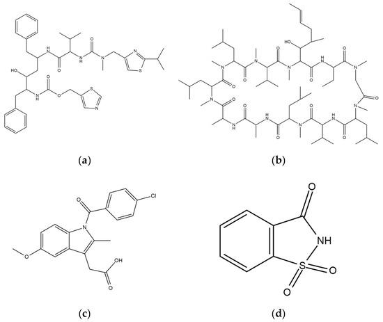 Chemical structures of (a) RTV, (b) CYP, (c) IDM and (d) SAC.