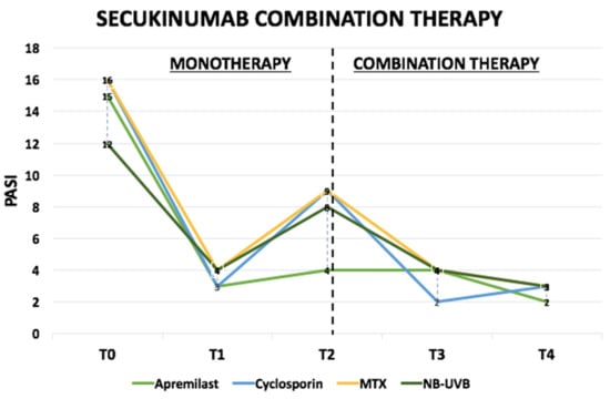 Nowadays, MTX is regarded as the first line of combination therapy for its adjuvant potential and preventive effect against immunogenicity mainly described in TNF-α inhibitors [60]. Despite its large diffusion in the real-life setting, no protocols are validated [61]. We used MTX in case of secukinumab secondary failure in patients with a flare or de novo PsA and with hypertension. The other option for PsA, especially in case of new onset enthesitis was apremilast, it acts on the PDE-4 and resets both immune and endocrinological systems [62,63,64]. Conversely, cyclosporine and NB-UVB were destined to patients that experienced cutaneous flares; cyclosporine was privileged in case of severe cutaneous flares with erythema and logistic/physical difficulties to attend the NB-UVB appointments, whilst NB-UVB in patients with hypertension and electrolytes disorders. In case of psoriasis cum pustulatione or concomitant new onset pustular psoriasis the logical option will be to combine acitretin, but in the present study we did not face this case.