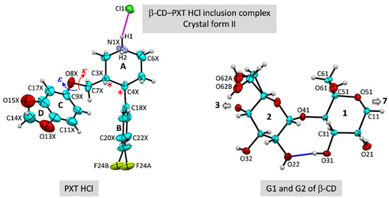 The crystal structure of the β-CD–PXT complex in the triclinic system (form II) was solved by the intrinsic phasing method with SHELXTL XT [54], providing all non-H atoms of β-CD and PXT molecules with full site occupation, hence the host–guest stoichiometric ratio was 1:1. The missing non-H atoms of solvents (water and ethanol) and chloride ions were located by difference Fourier electron density maps graphically assisted by WinCoot [56]. The protonated PXT molecule (at N1X axial position, H2) was counterbalanced and directly coordinated (at N1X equatorial position, H1) by a fully occupied chloride (Figure 1), as normally observed in the crystal structures of TCAs and SSRIs in free HCl salt form. By contrast, most crystal structures of the β-CD encapsulation of TCAs and SSRIs had two half-occupied chlorides, which were not in direct contact with the protonated drugs, as pointed out in our previous works [33,34].