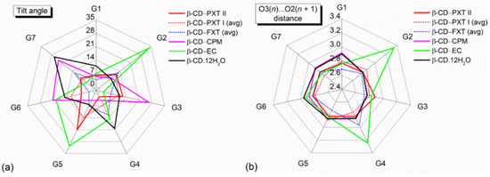 Radar plots of (a) tilt angles and (b) O3(n)∙∙∙O2(n + 1) distances of the β-CD glucose units (G1–G7) depicting the host conformational changes upon inclusion of the halogen-containing antidepressants, clomipramine (CPM) HCl [32], PXT HCl (form II), PXT base (form I [35]) and fluoxetine (FXT) HCl [34], of which the averages of two similar β-CD monomers in the β-CD dimer are shown. For comparison, data of the inclusion complex of β-CD–(–)-epicatechin (EC) [42] and the uncomplexed β-CD·12H2O [40] are included; see also Table S2. Angles and distances are in ° and Å.