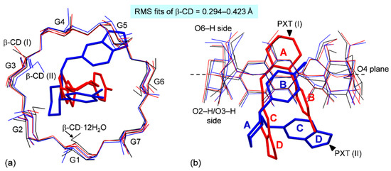 Structure overlays of the two β-CDs in complex with PXT (wireframes: blue—form II and red—form I (main host β-CD #2 [35]), and the uncomplexed β-CD·12H2O (black wireframe [40]), viewed from (a) the top and (b) the side. RMS fits are computed for the host β-CDs, excluding O6, H atoms and guests.