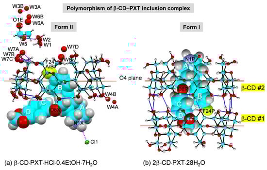 Here, we add the 1:1 β-CD–PXT complex to the list of elusive polymorphisms in CD inclusion complexes. Crystal form II of β-CD·PXT HCl·0.4EtOH·7H2O belongs to the triclinic, space group P1, whereas crystal form I of the 2β-CD·PXT base·28H2O pertains to the monoclinic, space group P21 [35]. The β-CD–PXT polymorphism stems from the PXT conformational flexibility, which is defined by torsion angles κ, ε around the bridge -CH2–O- connecting the A- and C–D-rings. While PXT (II) in an open V-shaped conformation has the B-ring shallowly inserted into the β-CD cavity, PXT (I) in a closed U-shaped structure is mostly entirely embedded in the β-CD dimeric cavity; the A-ring is deeply inserted in the main β-CD cavity. Even though the distinct PXT inclusion scenarios and conformations are notable, PXT molecules in both crystal forms are similarly maintained in the CD cavity via host–guest N–H···O5/O6 H-bonds and C/O–H···π(B/C) interactions and β-CDs have similar 3D arrangements, channel (II) vs. screw-channel (I).