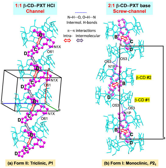 Elusive polymorphism of CD inclusion complexes demonstrated for (a) 1:1 β-CD–PXT HCl in triclinic, P1 (form II) packing in the channel structure and (b) 2:1 β-CD–PXT base in monoclinic, P21 (form I) existing in the screw-channel structure [35]. β-CD macrocycles and PXT molecules are shown with cyan wireframes and magenta ball-and-stick models, respectively. For better visibility, water molecules, chlorides and H-atoms are omitted. The crystal lattices are stabilized not only by O–H∙∙∙O H-bonds within and between β-CDs, but also by the host–guest N–H···O, O–H···N H-bonds, intramolecular face-to-face π∙∙∙π (form I) and edge-to-face intra-, intermolecular π∙∙∙π and C–F···π interactions (form II).