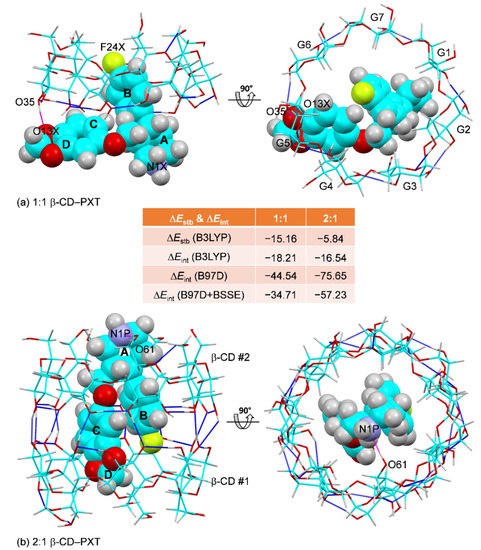 Both host CD and guest drug exhibit conformational flexibility to an extent, particularly in this case, where the primary hydroxyls O6–H of β-CD and the CH2–O group bridge the A- and C–D-rings of PXT. This is to attain thermodynamically favorable CD inclusion complexes with optimum host–guest interactions, reflecting the importance of the induced-fit mechanism [57]. Hence, an arbitrary starting structure of a CD inclusion complex could plausibly lead to a local minimum in the potential energy surface, giving rise to a meaningless energy-optimized structure. On the other hand, the meaningful structure–energy relationship can be reliably established via complete-geometry optimization of the initial X-ray-derived structure using density functional theory (DFT) calculation. This has been successfully demonstrated in our previous works on tea catechins [58], olive polyphenols [59], coffee chlorogenic acid [60] for the H-bond-stabilized complexes, and antidepressant drugs including TCAs [33], SSRIs [34] for the CH···π-stabilized complexes.