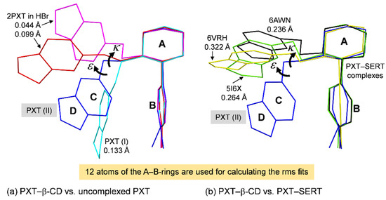 Scrutinizing the varied PXT structures allows us to get to the bottom of their conformational flexibility. The distinction of crystal lattices covers PXT in an uncomplexed state, PXT entrapped in the carrier (CD) cavity and PXT in complex with SERT protein. Whereas the A-rings are in a similar chair conformation, the planar B-rings linked at C4 are more-or-less perpendicular to the plane passing through the C2–C3–C5–C6 atoms. This is indicated by torsion angle C5–C4–C18–C19 in a short span of −119.6° to −130.5° for the uncomplexed PXT and PXT (I, II), and in a larger range of −94.1° to −154.3° for PXT–SERT complexes (Table 3). This is reflected from the corresponding respective rms fits of 0.044–0.133 Å and 0.236–0.322 Å, which are computed from the rather rigid A–B-rings and those of PXT (II), which is a reference structure (Figure 7a,b). If the C–D-rings are also included (i.e., all atoms are considered) for the calculation, the rms fits exceed 3 Å. Although a glimpse of the C–D-rings shows similar planar structures in varied circumstances, a gaze at them reveals that the D-rings mostly adopt an envelope form, except for those of PXT (II) in a rare twist form and PXT–SERT (6AWN) in a planar structure (Figure 7a,b). This is because 1,3-dioxole has a large out-of-plane thermal motion, giving rise to its existence as either a puckered form or a planar structure with a small energy barrier of 0.36 kcal mol−1 [48]. PXT molecules in the varied lattice environments, of which the C-rings mostly make acute-to-right angles (42.3–87.6°) with the B-rings and the centroid–centroid distances, are 5.457–7.197 Å (namely, the open V- to L-shaped conformations). Conversely, PXT is conformationally forced to exist in a closed U-shaped conformation in the β-CD dimeric cavity with an interplanar angle of the B and C ring of 9.0° and the centroid–centroid distance of 3.637 Å (Figure 7a,b and Table 3).