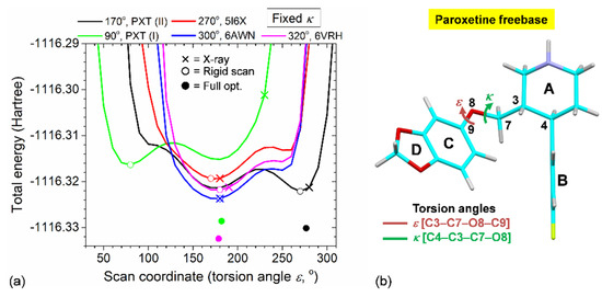 Figure 8 depicts the PESs based on total energy (Etot) of five PXT conformers with fixed κ = 90°, 170°, 270°, 300° and 320° and scan coordinate ε = 30–310° with an increment of 10°. After the PES rigid scans, to obtain a minimum total energy (Etot_min) for each conformer (see ○ in Table 3 and Figure 9), PXT (II) had an Etot_min at the coordinate (κ, ε) = (170°, 270°), while those of the other four PXT conformers were at (90°, 80°) for PXT (I), (270°, 170°) for 5I6X, (300°, 180°) for 6AWN and (320°, 180°) for 6VRH. Clearly, all five PESs have a common feature of one saddle and two wells with the total energy differences and energy barriers of <1 and ~3 kcal mol−1 for PXT (II) partially and PXT (I) totally embedded in the β-CD cavity, and of ~4 and ~4 kcal mol−1 for PXT in complex with SERT (5I6X, 6AWN and 6VRH), Figure 8. This indicates that one conformer (coincident with the X-ray structure) is energetically preferable over the other one. For the uncomplexed PXT, HBr comprises two different molecules in the asymmetric unit [51], whereas PXT molecule 1 is similar to PXT–β-CD form II, PXT molecule 2 is like PXT–SERT (6AWN), Figure 9 and Table 3.