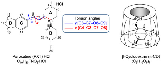 Depression can be efficiently treated by selective serotonin reuptake inhibitors (SSRIs)—second generation—and tricyclic antidepressants (TCAs)—first generation medications. The antidepressants approved by the US Food and Drug Administration [11] include, for example, SSRIs—escitalopram (Lexapro), fluoxetine (Prozac), sertraline (Zoloft)—and TCAs—amitriptyline (Elavil), doxepin (Sinequan), imipramine (Tofranil). Paroxetine (Paxil; PXT), a family member of SSRIs, comprises the piperidine A-ring, which is linked at C3 via the C7–O8 bridge to the 1,3-benzodioxole moiety (C–D-rings) and is connected at C4 to the 4-fluorophenyl (B-ring). Hence, PXT without a side chain is the bulkiest and highly conformationally flexible SSRI; see the two key torsion angles κ, ε in Scheme 1. While SSRIs are structurally diverse, TCAs are structurally similar. Both drug types have equivalent efficacy in treating depression. TCAs have a drawback of higher side effects compared to SSRIs due to their less-specific binding to the serotonin transporter (SERT). However, the uses of both TCA and SSRI drugs are limited due to their low water solubility and undesired side effects. To improve the drug bioavailability, cyclodextrin encapsulation is a suitable method, as demonstrated for TCAs [12,13] and SSRIs [14,15,16,17].